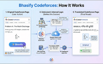 Bhasify Codeforces är en kraftfull tillägg för Chrome som hjälper programmerare att övervinna språkbarriärer genom att översätta Codeforces-problem till över 100 språk, inklusive Hinglish, spanska och japanska. Denna användarvänliga tjänst använder Google Gemin API för att säkerställa att matematiska ekvationer, kodblock och HTML-formattering bevaras på ett intelligent sätt, vilket gör att den logiska och matematiska strukturen för problemet förblir intakt. Med lokal caching för snabb åtkomst och en säker arkitektur som tillåter användare att använda sina egna nycklar, optimerar Bhasify upplevelsen för programmerare som vill fokusera på att lösa algoritmer snarare än att tolka komplexa engelska beskrivningar.